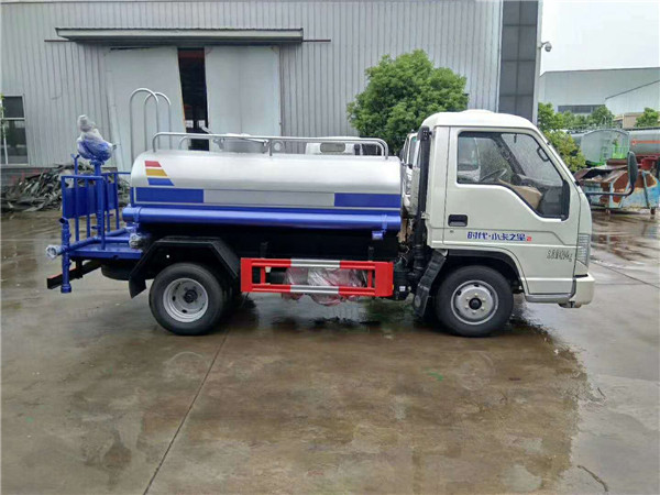 灑水車噴水出口: 前沖,后灑,后工作臺高炮,前沖(噴)后灑、帶側噴(花灑)、帶后工作平臺、平臺上安裝綠化灑水高炮(炮有大雨、中雨、毛毛雨、霧狀可調節),帶吸水管,帶消防接頭
