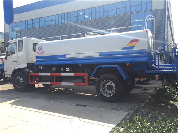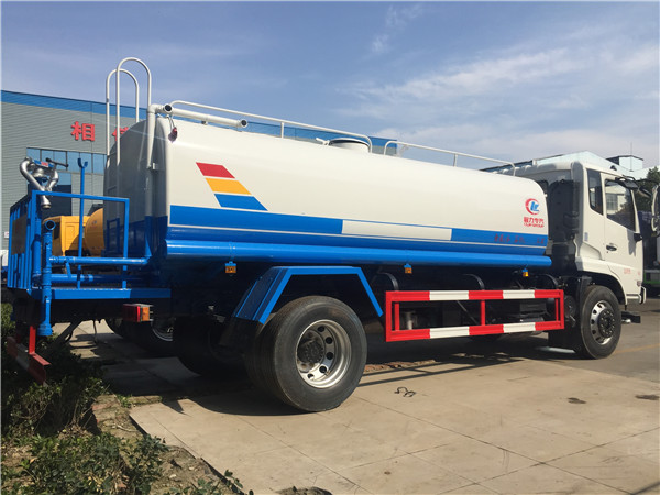 灑水車前裝有鴨嘴型噴霧或圓頭沖嘴,后面裝有圓柱形灑水砣,側噴花灑蓮花頭,車后部裝有高射噴槍。(選裝)