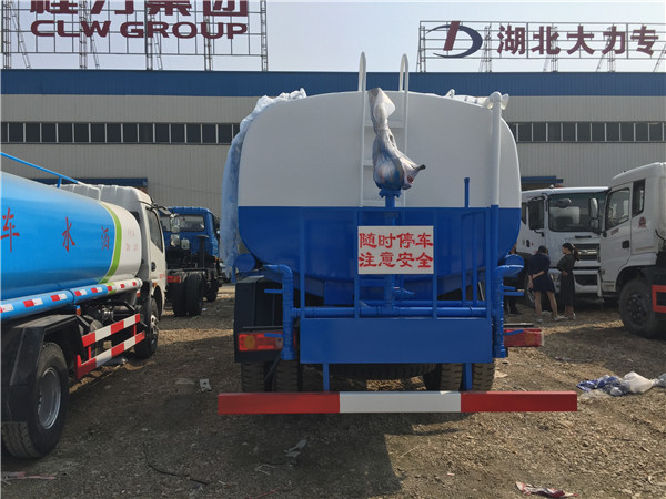 10噸東風灑水車底盤采用東風大多利卡(十堰產),3800mm軸距,帶動轉,7.5尼龍胎,氣剎,電子熄火。前沖后灑,后工作平臺帶高炮,右位花灑,側噴。罐體9.2噸,金龍泵,前沖后灑,后工作平臺帶高炮,右位花灑,側噴。