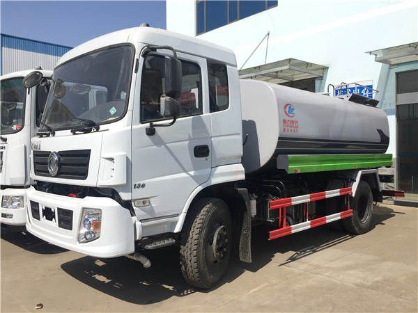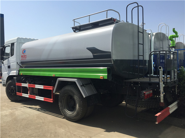 2、新款東風專底灑水車標配前沖、后灑、側噴、后工作平臺、綠化炮、自流閥、消防接口、水位計各1個,輸水管3米2根,罐體右后上方帶花灑2個。