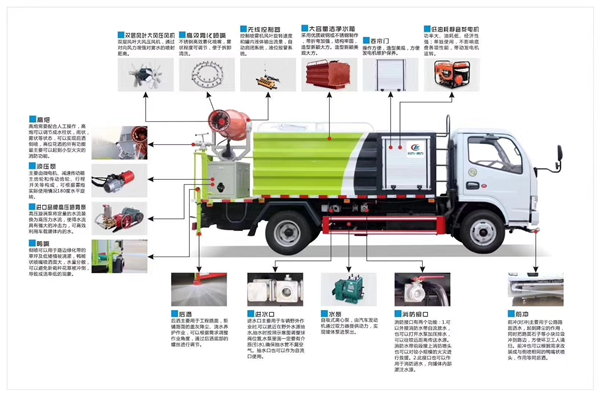 1、抑塵車前沖、前噴――前沖標(biāo)配的是三彎前沖噴頭,可任何調(diào)節(jié)灑水方向,常用于路面灑水,一般位于駕駛室前下方,主要噴射柱狀水流,射程14米,可將路面的垃圾及雜物沖至道路兩旁供清掃清潔,同時(shí)水遇到灰塵后結(jié)伽,防止車輛來往造成的揚(yáng)塵。也可選裝前噴噴頭,即用鴨嘴噴頭替代三彎前沖,噴出的水流呈扇形,像一把水鏟一樣,可以將路面沖洗得更為干凈,但相應(yīng)噴灑距離縮小,適合單邊道路的沖洗。