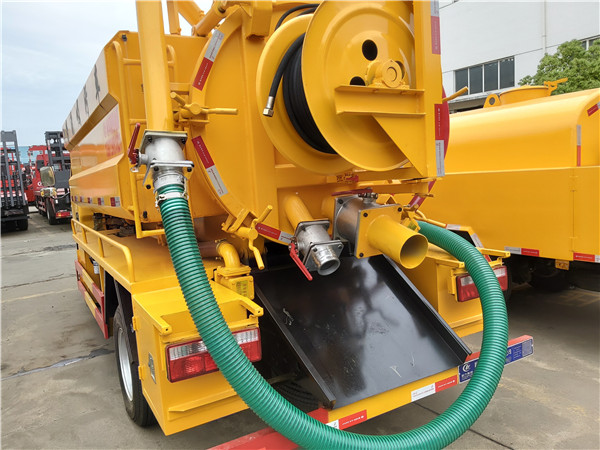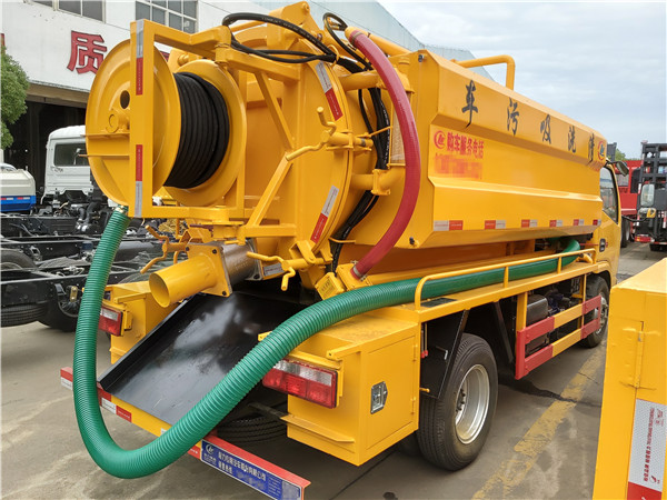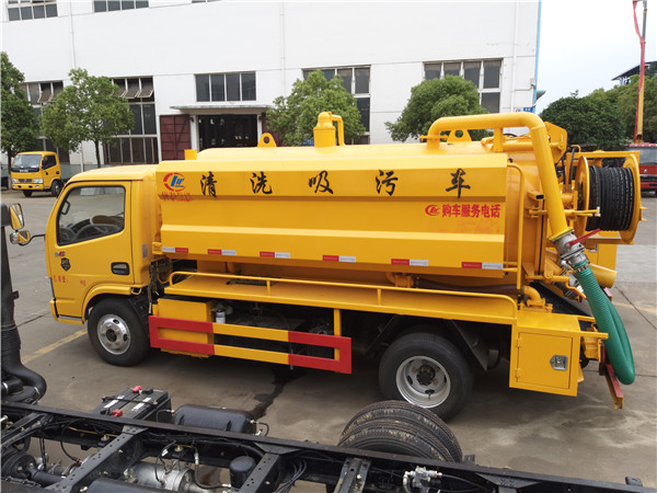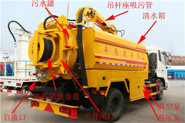 聯合疏通高壓清洗吸污車專用部分由取力器、傳動軸、真空吸污泵、壓力罐體、液壓部分,管網系統、真空壓力表、視糞窗、洗手裝置等組成,隨車配置大功率真空吸污泵和優質液壓系統,罐體封頭一次壓鑄成型、罐體可后開、雙頂自卸。罐內污物可通過后蓋直接傾倒,具有真空度高(比吸糞車的吸力更大)、噸位大、效率高、用途更廣泛的特點。