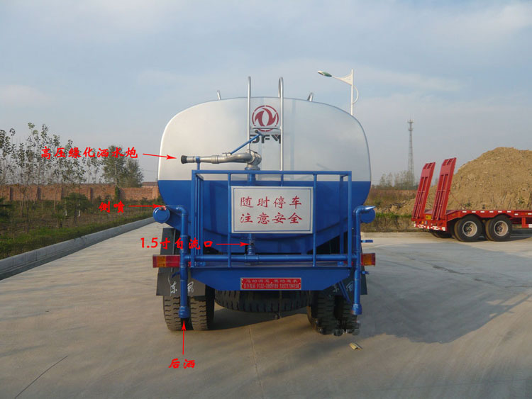 - 灑水車后灑功能:后灑一般適用于工程路面灑水,如新修的公路為防止路面干燥速度過快,造成炸裂現(xiàn)象,通常用在新修的路面上鋪設(shè)遮蓋物,并定時灑水車,以保持新路面的濕潤。