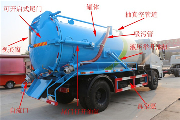 真空吸污車的專用部分是由取力器、傳動軸、真空吸污泵、壓力罐體、液壓部分,網管系統、真空壓力表、視污窗洗手裝置組成,隨車配置的有大功率真空吸污泵和優質的液壓控制系統,罐體封頭一次鑄成型、罐體可后開、雙頂自卸。罐內的污物可通過后蓋直接傾倒出來,具有真空度高、噸位大、效率高、用途更廣泛的特點。