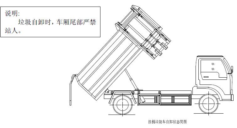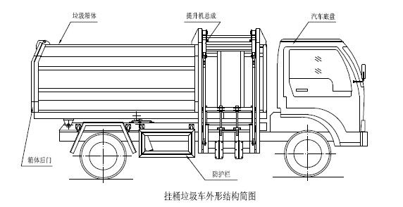 程力專用汽車掛桶式垃圾車(以下簡稱垃圾車)是用于城鎮內的垃圾收集、轉運、卸料作業的專用車輛。該車是由汽車底盤、自卸油缸、提升機總成、頂蓋(選裝)、附車架、垃圾箱體等組成。該車操作由液壓控制系統來完成,控制方式可以為手動或電氣控。該車主要用于城鎮垃圾的垃圾收集、轉運和卸料。操作開提升控制閥將垃圾桶隨提升機向上升起并翻轉傾斜,桶內垃圾被倒入車廂內完成垃圾單次裝載,反向操作提升控制閥,垃圾桶隨提升機而放下;完成垃圾裝載后再進行傾卸時,操作自卸控制閥,垃圾箱繞后翻轉軸傾斜體舉,箱體后門打開,垃圾傾卸出箱體;起該車由液壓控制系統來完成該車的提升機的上升和下降及垃圾的自卸功能,降低了工人的勞動強度和改善了工作環境。該垃圾車的收運方式是目前國內泛采用的垃圾收集轉運方式,其專用裝置的功能均以汽車發動機為動力,通過液壓機構手動或電控、氣控來實現。車輛的箱體采用優質炭鋼板全密封焊接結構,具有強度高、重量輕,防塵、防溢不產生二次污染等優點。垃圾車整車基本性能與原底盤車相同,用戶請參閱原底盤車使用手冊。本用說明書僅介紹專用改裝部分的有關操作、檢查和維修保養。在使用車輛前,我們強烈要求您能夠通讀本說明書,并對其中的操作程序做到得心應手。我廠對產品將會進一步改進。產品的改進、性能的提高、結構的不斷完善恕不另行通知,從而有某些說明不適用于您的特定車輛,敬請諒解。