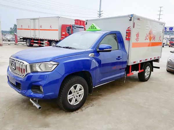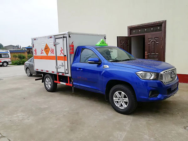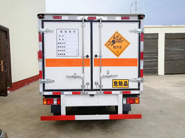 廂體全金屬整體骨架結(jié)構(gòu),外飾冷軋鋼板(隔熱,防靜電),內(nèi)飾鋁板(隔熱,防靜電),中間骨架結(jié)構(gòu)(提高廂體強(qiáng)度),所有箱板內(nèi)部填筑阻燃高強(qiáng)度泡沫板整體高壓粘合鉚接后焊接拼裝成廂型,底板鐵板上鋪設(shè)防靜電膠皮(絕緣,導(dǎo)靜電),前臉底部鋁板上加裝靜電防撞膠皮,內(nèi)飾臥環(huán)(固定貨物定位拉環(huán)),透氣孔,外部帶通風(fēng)孔,保持廂體與外部空氣流通,及時與外部空氣交換,確保安全,大梁加裝拖地靜電膠帶,把貨物摩擦靜電導(dǎo)入大地。車輛門框配備防盜報警器,廂內(nèi)頂部安裝煙霧報警器,前廂板左右立柱安放滅火器,排氣管前置安裝排氣火花熄滅器,駕駛室安裝“危險品”標(biāo)志燈,車廂外中部粘貼橙色反光帶一周,并在車廂左、右、后安裝“爆炸品”菱形牌3塊,車體后部設(shè)置安全告示牌、“危險品”黃色警示牌,后保險杠安裝緩沖加強(qiáng)橡膠塊等。車廂開側(cè)門,方便裝卸貨物;可加開隔倉,方便不同性質(zhì)的爆破物品同車分倉運(yùn)輸。